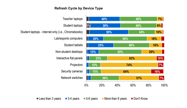 Recognizing when failures increase enables districts to schedule timely refresh cycles. For example, student-assigned laptops have a lifespan of less than five years, and as they near that point, the likelihood of failure and costly repairs increases sharply.