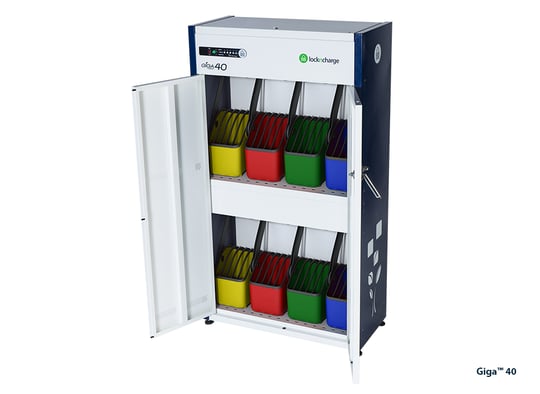 - Charge up to 40 laptops or tablets in one streamlined cabinet.